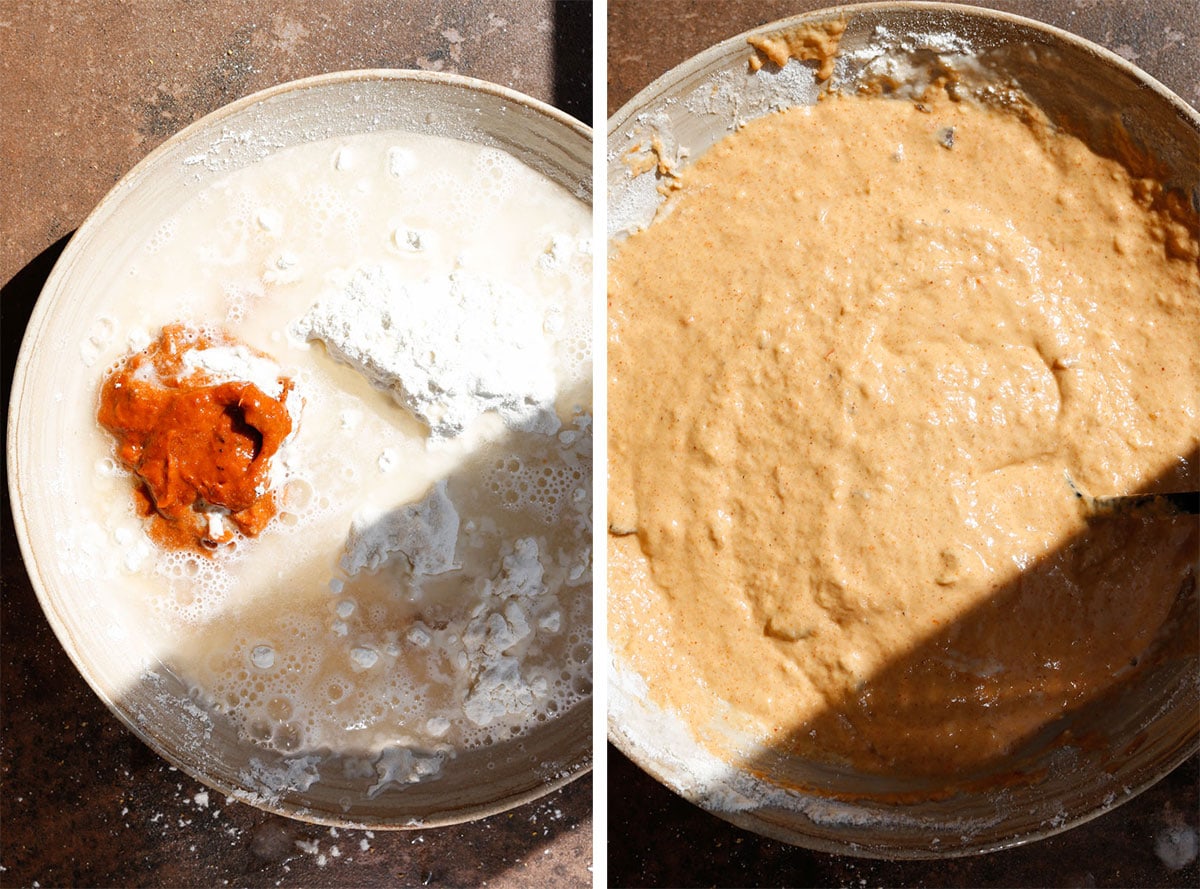 In one bowl, whisk together the water, flour, and 1/4 cup of the homemade peri peri sauce until you have a smooth, slightly thick batter. This acts as a flavour-packed marinade, helping the coating stick while infusing the mushrooms with bold peri peri flavour.