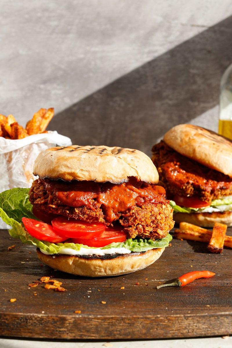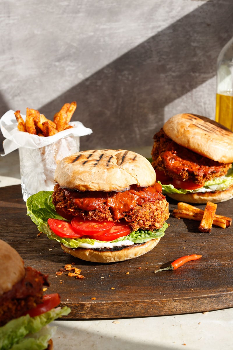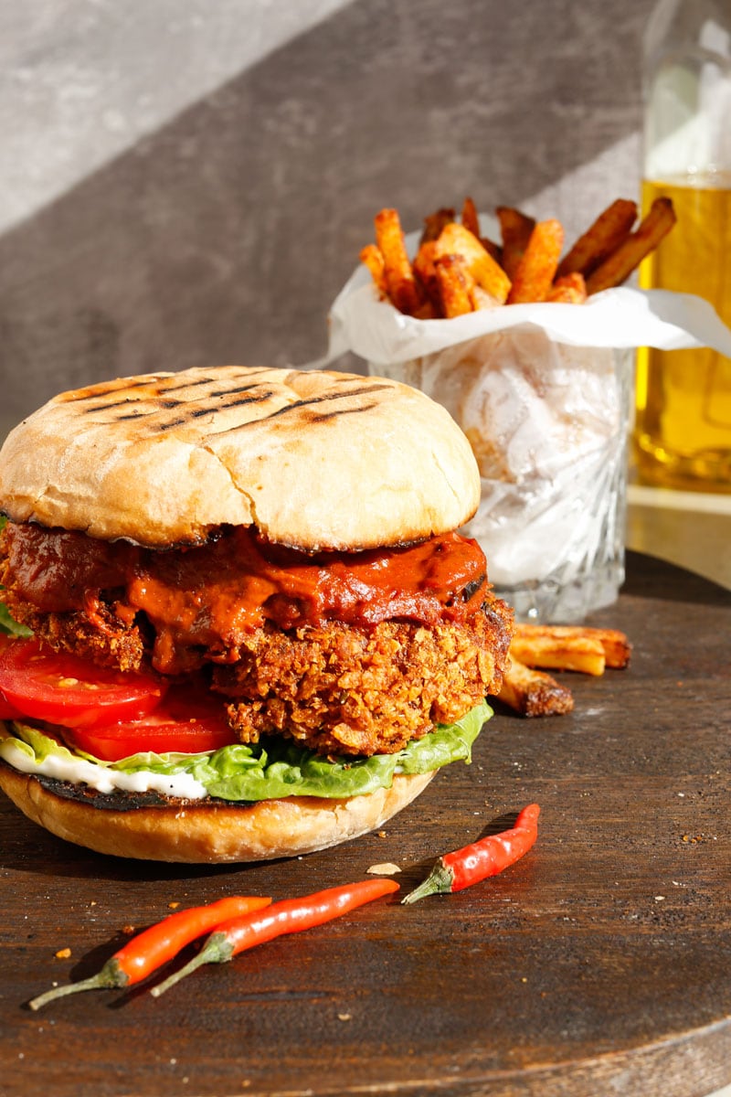 This vegan peri peri chicken burger was born out of being tired of not having a proper vegan peri peri burger option when craving a Nando’s-style meal. Inspired by the bold flavours of Nando’s, it’s made with crispy oyster mushrooms coated in seasoned crushed cornflakes and baked until golden and crunchy. The homemade chick’n fillet is then layered into a toasted bun and drenched in a smoky, fiery peri peri sauce made from roasted red peppers, onion, garlic, lemon, and red bird’s eye chillies, all charred for deep flavour.