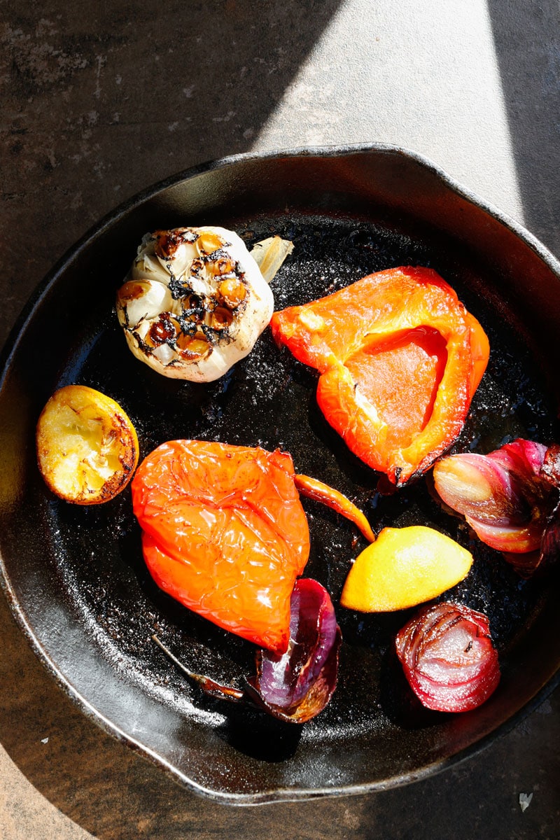 Start by cutting the red pepper, onion, and lemon in half, and slicing the top off a whole bulb of garlic to expose the cloves. Drizzle a skillet with olive oil, then place everything cut-side down so it can properly caramelise. Add the red bird’s eye chillies and roast until the edges start to blister and char.