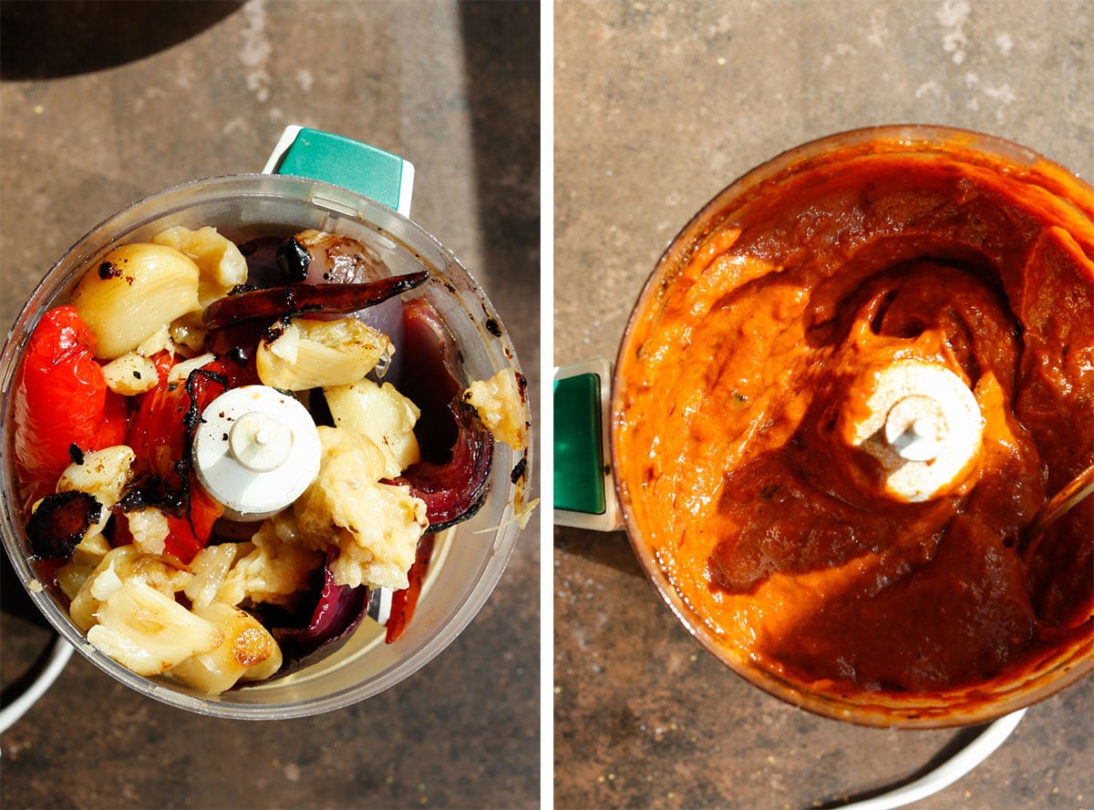 - Transfer the roasted vegetables to a blender. Squeeze in the lemon pulp (remove any seeds) and add the softened garlic cloves. Blend until mostly smooth, then add smoked paprika and salt. Blend again until smooth and glossy.