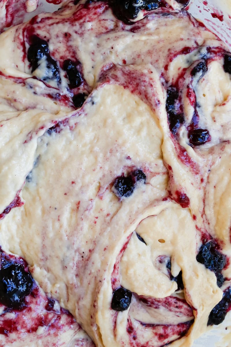 Dollop 1–2 tablespoons of blueberry jam, and fold together 1-2 times, this creates pretty ribbons of jam that peek through each muffin, giving bursts of fruity sweetness and a gorgeous visual effect without turning the whole muffin purple.