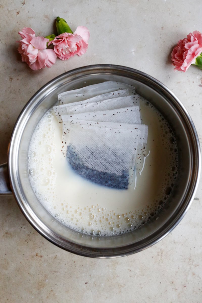 Heat the soy milk gently and steep the Earl Grey tea bags for 10 over low-medium heat or until deeply fragrant. Gently press the bags using a strainer, then top up with more soy milk to bring it back up to 70ml. Set aside to cool.