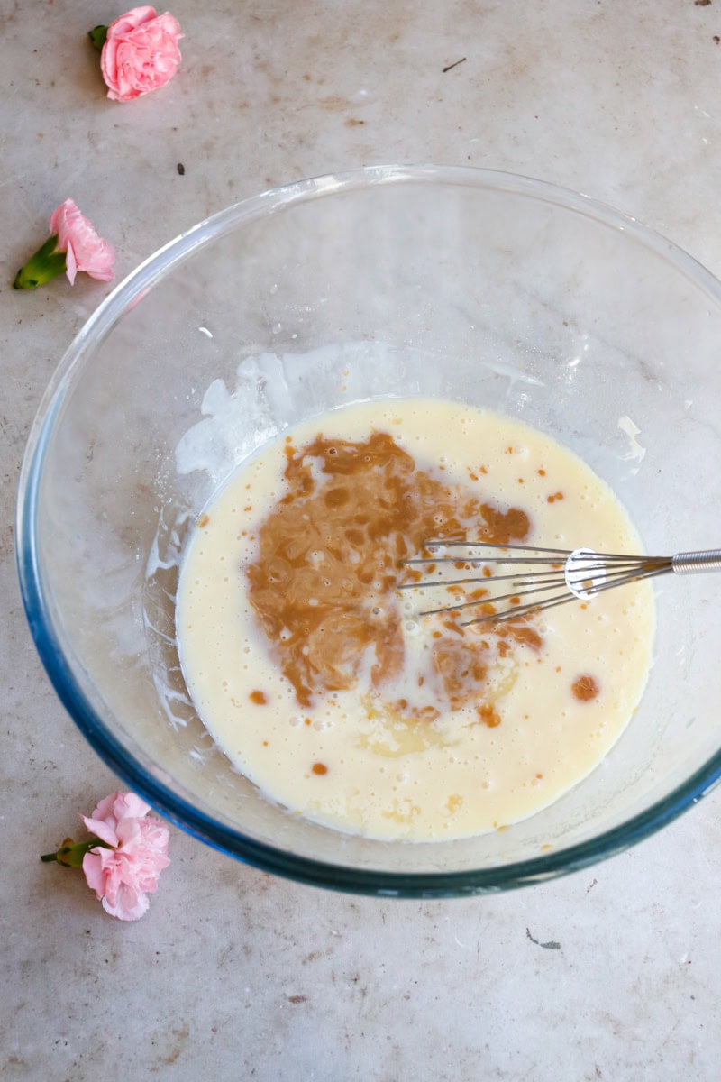 Once your tea is ready and your oven is preheated, it’s time to assemble the batter. Start with the wet ingredients. In a large bowl, whisk together the melted vegan butter, granulated sugar, and thick Greek-style vegan yoghurt until smooth and glossy. The butter adds richness, while the yoghurt contributes moisture and tender crumb, it’s also what makes a flax egg unnecessary. Stir in the cooled, tea-infused milk and lemon juice. At this stage, your batter is soft, fragrant, and ready to meet the dry ingredients.