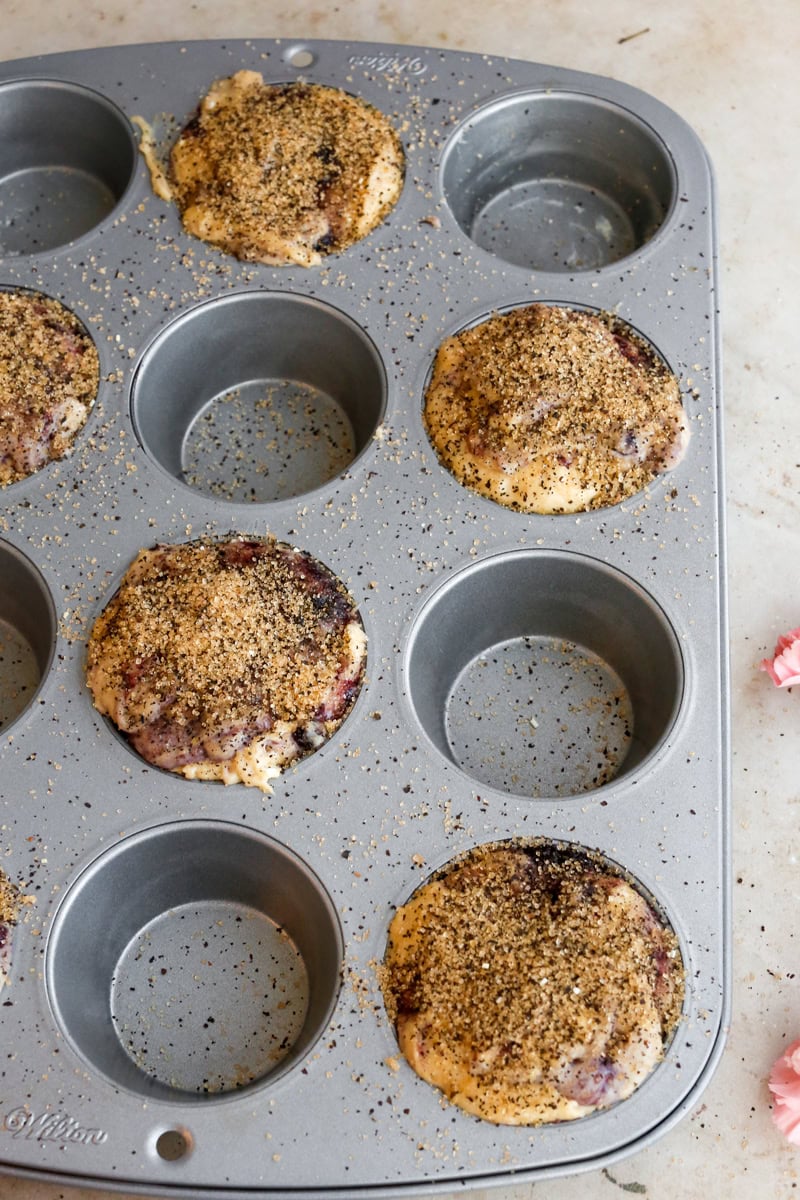 Dollop the blueberry jam over the batter and fold just 1–2 times to create visible swirls. Divide the batter evenly between the prepared muffin tin. Mix coarse brown sugar with loose Earl Grey tea and sprinkle generously over each muffin.