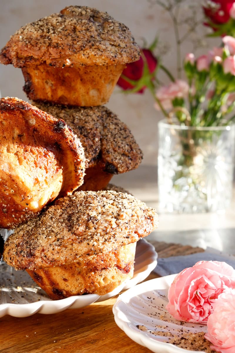 Instead of doing a regular crumb topping, I wanted to create a more bakery-style recipe, that’s unique so I decided on this crispy sugar-tea topping. This truly elevates the recipe perfectly. Remove the loose tea leaves from an Earl Grey tea bag. Mix with coarse brown sugar and sprinkle it generously over each muffin. During baking, this forms a caramelized, slightly crunchy crust that reinforces the tea flavor and adds café-style texture. It’s a MUST.