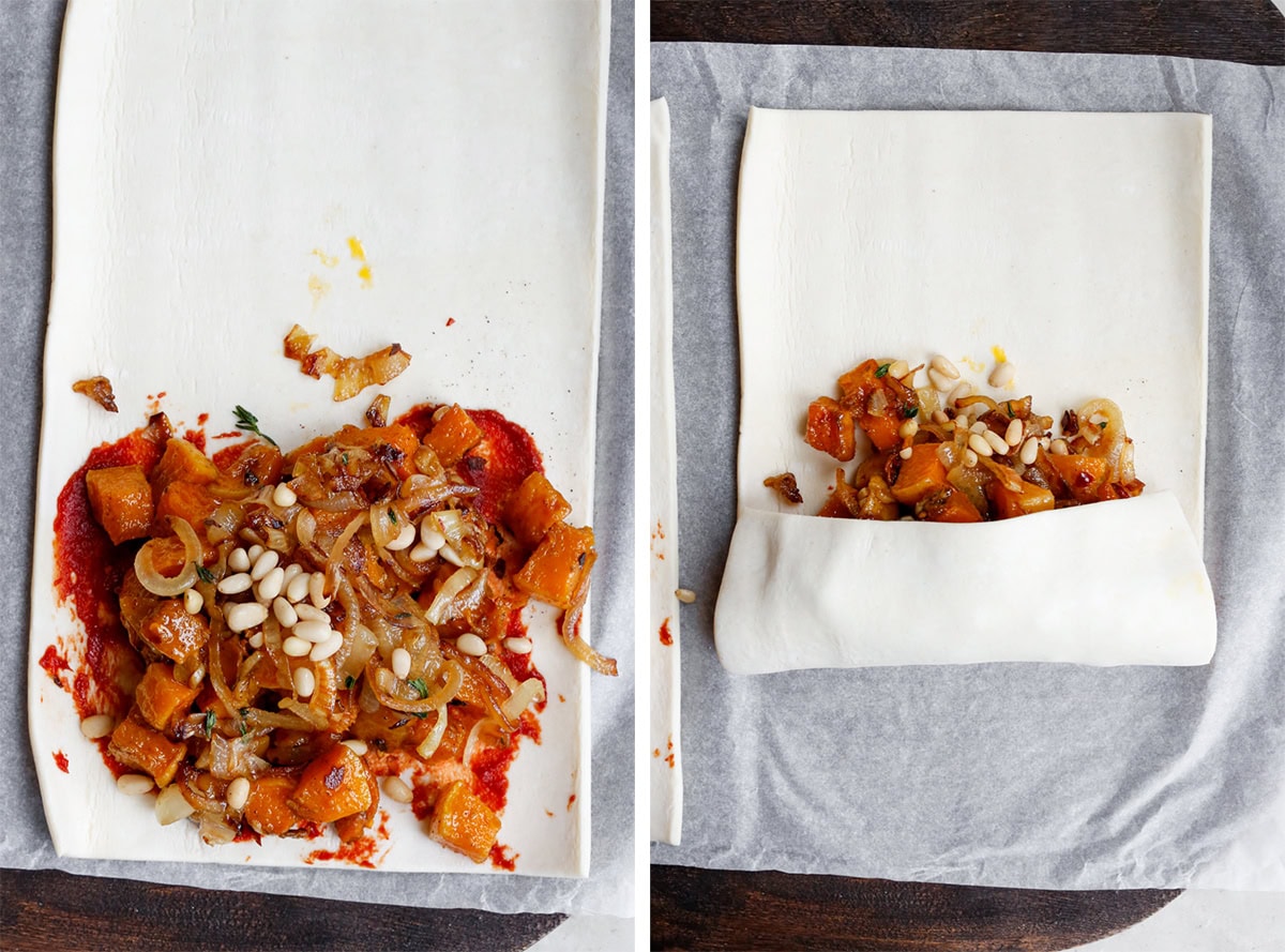 Remove the puff pastry rectangles from the fridge. On top of the pastry rectangles, spread tomato purée over one half (leaving a small border), then sprinkle with chilli flakes, salt, and black pepper. Add the cooled butternut squash, caramelised onions, and pine nuts on top. To roll: start from the filled side and gently roll up the pastry, just like you would with a cinnamon roll.
