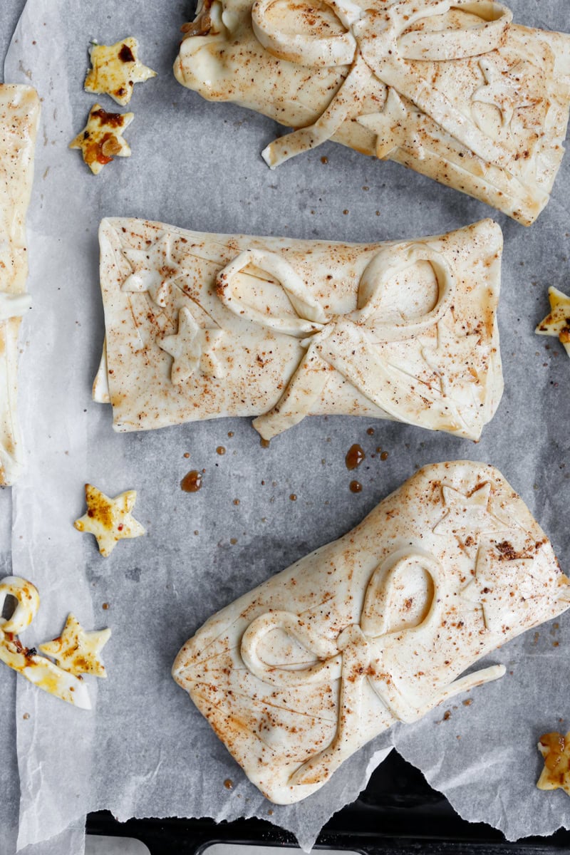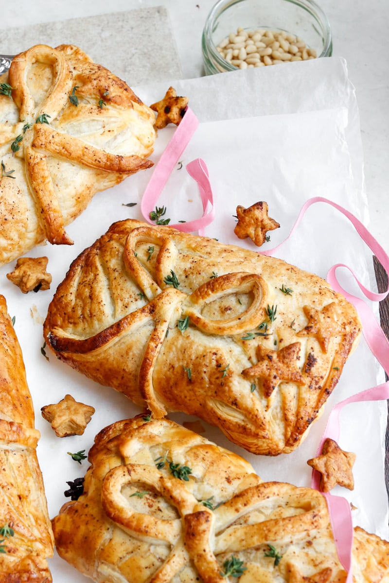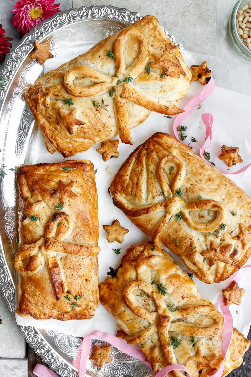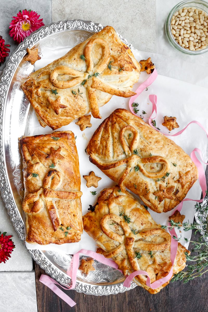 Press the bows on top of each parcel. In a small bowl, combine oat milk, maple syrup and a pinch of nutmeg. You know how a beaten egg creates a nice golden brown pastry, well, this is our vegan alternative! Brush over the puff pastry. Place the parcels back onto a large baking sheet and into the preheated oven for 35-45 minutes or until golden brown.