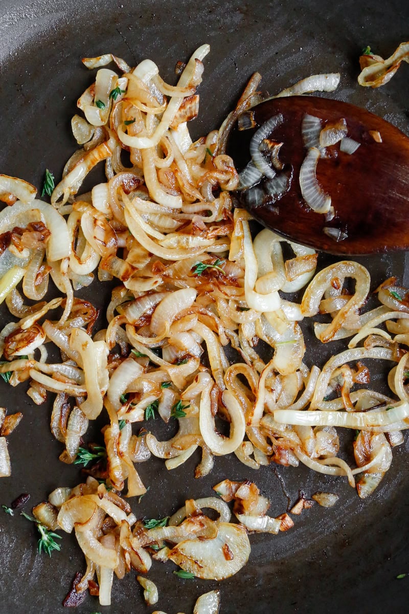 While the butternut squash roasts, caramelise the onions. Heat oil in a medium or large frying pan over low heat and add the sliced onions. Sometimes, caramelising onions can take forever… and to speed this up, I do this little trick: I simply turn the heat up to medium and allow the onions to caramelise while consistently stirring. If you stop stirring while on medium heat, you risk the onions burning, so be sure to keep an eye on them and never stop stirring. If you ever want to stop, even for a few minutes, just turn the heat back down to low. Once the onions have become golden and caramelised, transfer them into a bowl to speed up the cooling time.