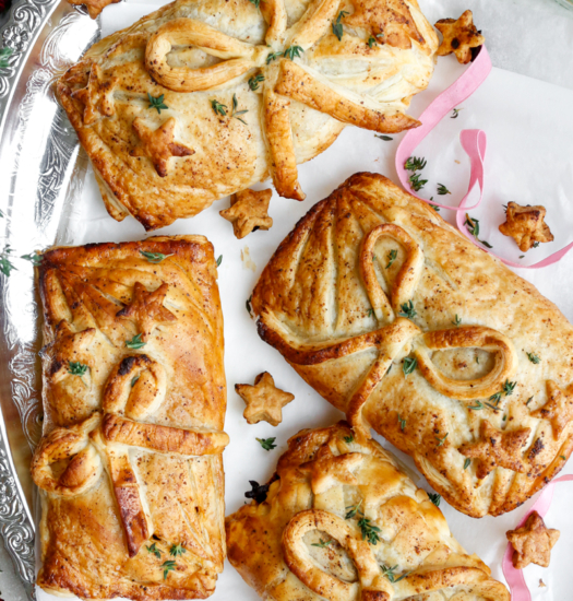 Press the bows on top of each parcel. In a small bowl, combine oat milk, maple syrup and a pinch of nutmeg. You know how a beaten egg creates a nice golden brown pastry, well, this is our vegan alternative! Brush over the puff pastry. Place the parcels back onto a large baking sheet and into the preheated oven for 35-45 minutes or until golden brown.